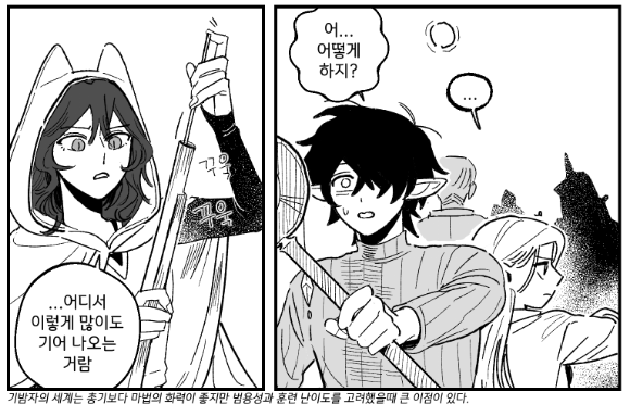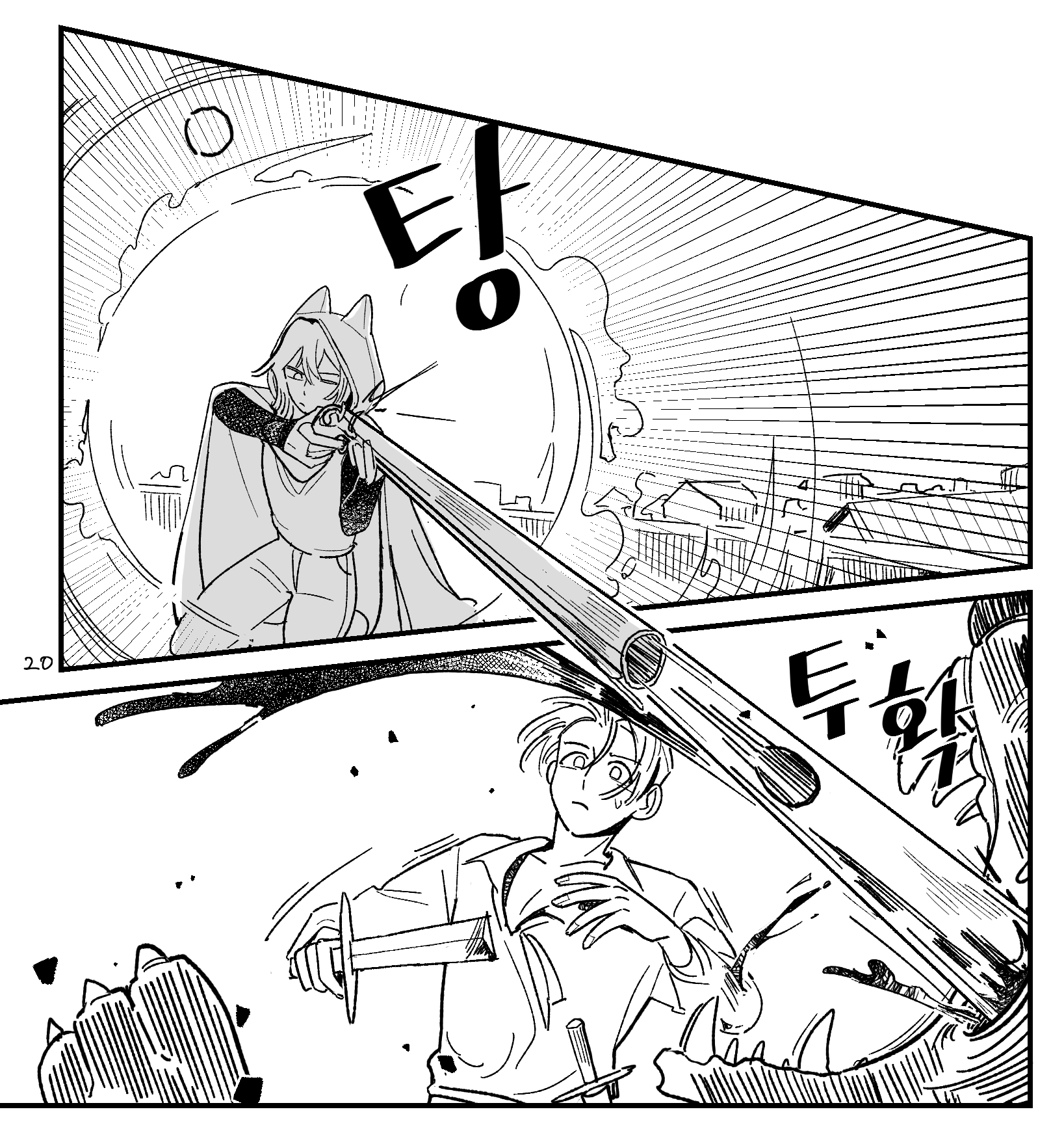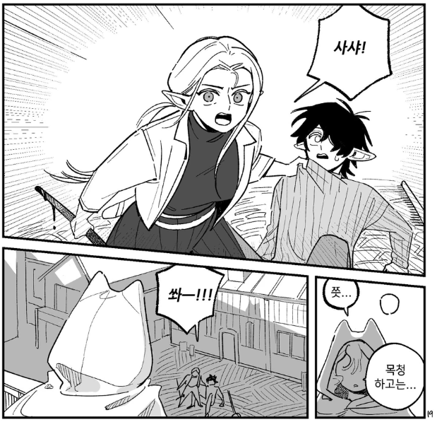 사샤는 멀리서 보고 있기 때문에 앞선 컷에서 보였던 마리와 괴물의 효과음들은 작성하지 않았음