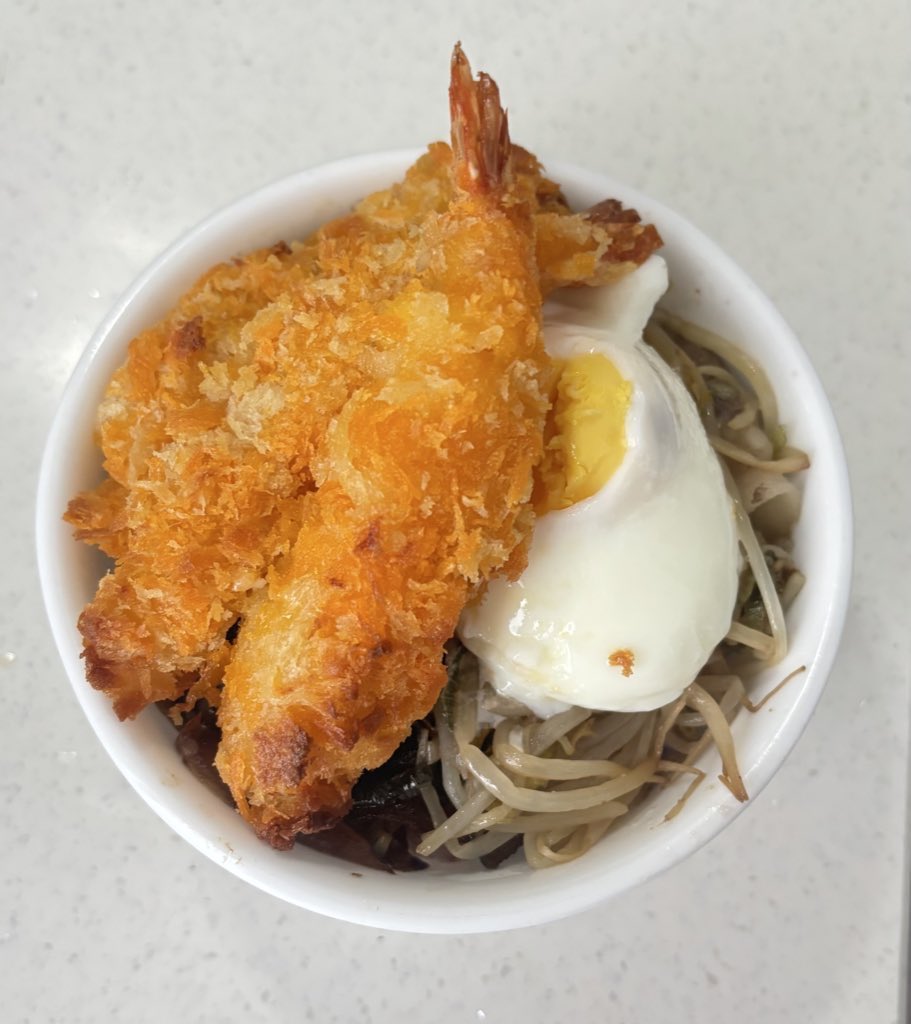 수란을 얹고 제품 새우 튀김을 기름 없이 에어프라이어에 구워 올렸다.